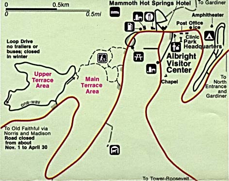 The North Entrance at Gardiner, Montana is the only entrance which remains open to wheeled vehicles year-round and is open for vehicle traffic only to Mammoth, Mammoth Terraces and East to Tower Junction and Cooke City, Montana. Snow tires or chains may be required.